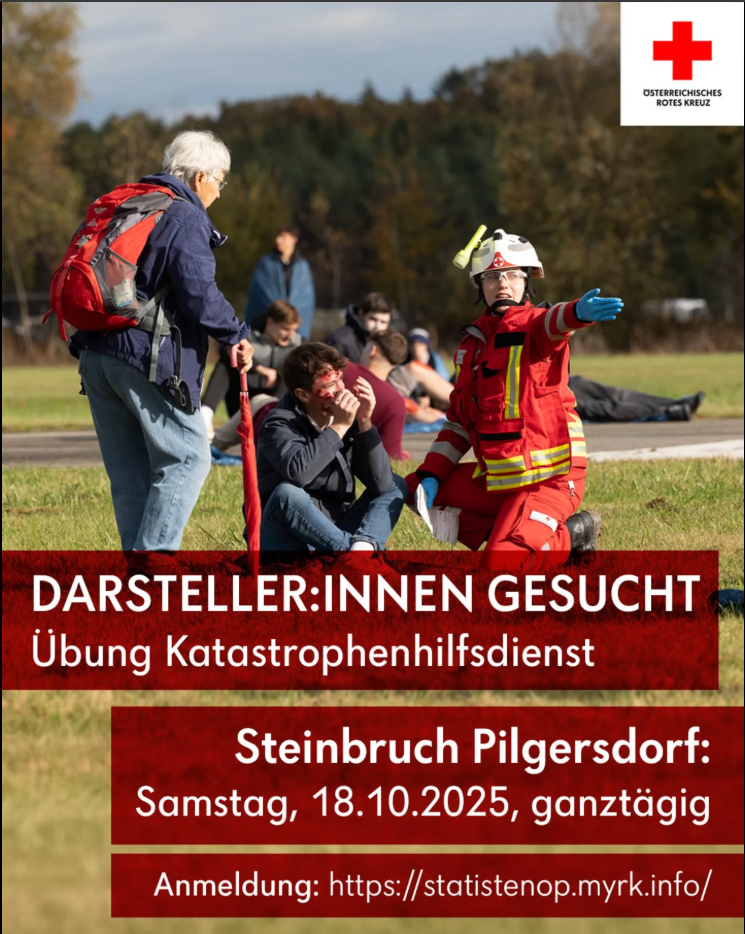 Für die groß angelegte Katastrophenhilfsdienstübung im Bezirk Oberpullendorf am 18. 10. im Steinbruch Pilgersdorf werden Darsteller:innen gesucht. Möchtest du dich schminken (Verletzungen, etc.), suchen (u. A. durch die Suchhunde) und retten lassen, dann melde dich hier an: