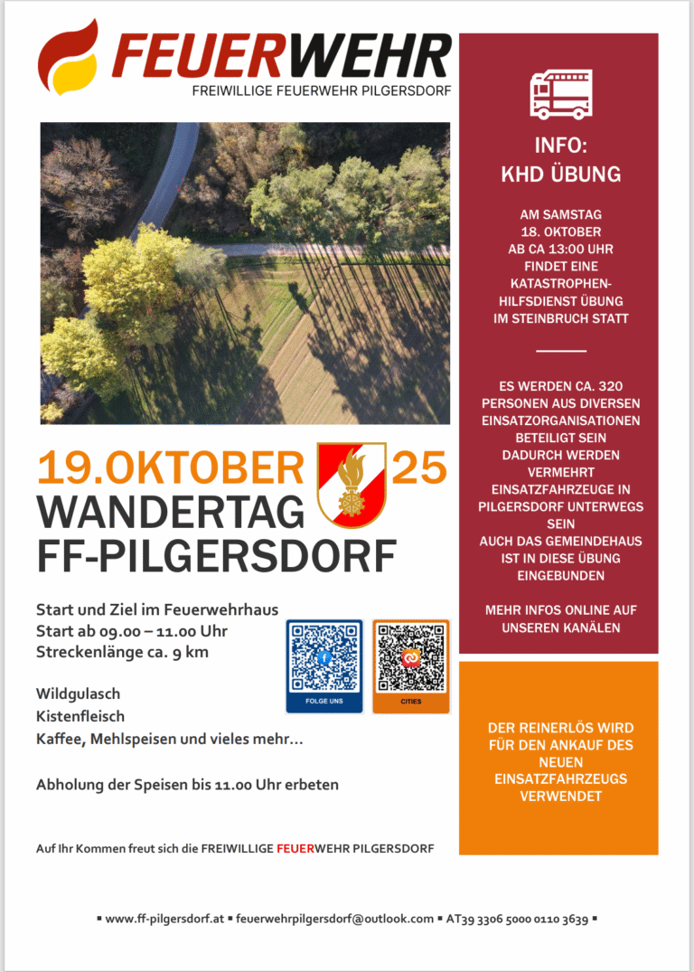 Die Jahreshauptdienstbesprechung der Feuerwehr Pilgersdorf wird am 28.Februar 2025 um 18 Uhr im Feuerwehrhaus stattfinden!
